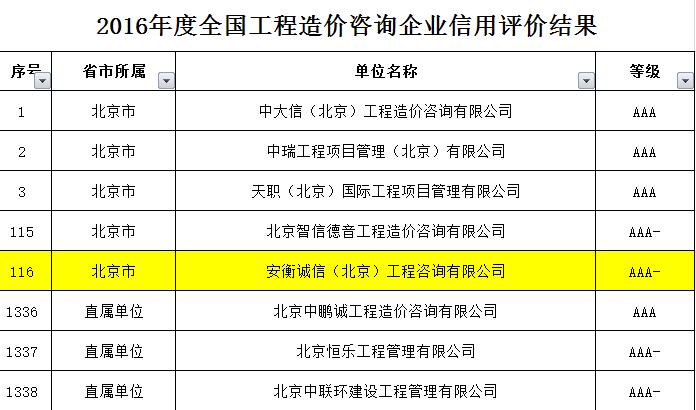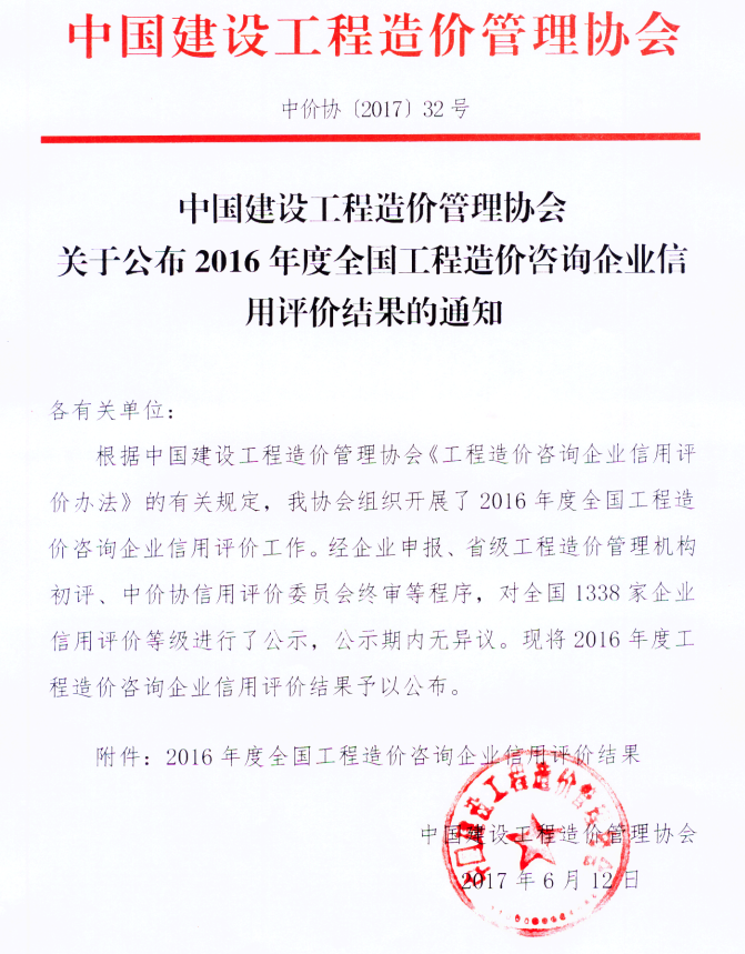 热烈祝贺我公司荣获2016年度全国工程造价咨询企业信用评价AAA